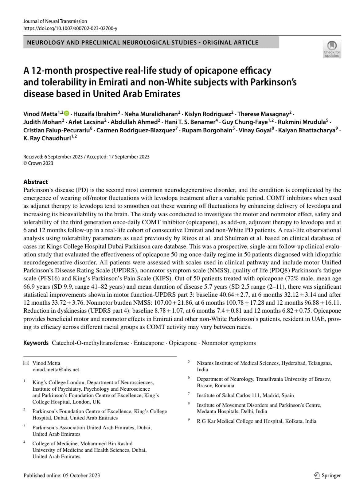 First Ever CROSS RACIAL ( Emirati & non white patients) Parkinson’s centre of excellence King’s Dubai led, real life research study introducing third generation COMT inhibitor Opicapone ( cross racial use) for patients with Parkinson’s in United Arab Emirates